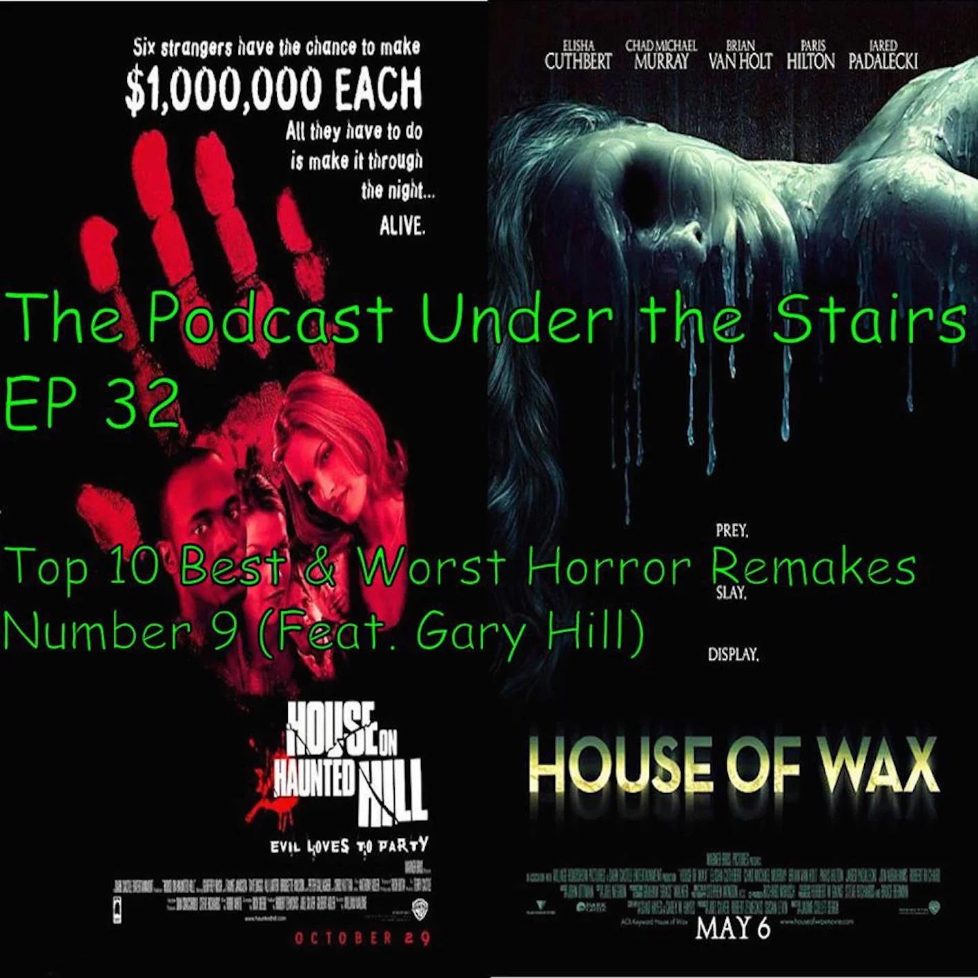 On this episode Duncan is joined by Gary Hill of Cinema Beef Podcast, Two Drink Minimum Commentaries, Sausagefest Reviews & The Bird & The Beard to continue the countdown of the Top 10 Best & Worst Horror Remakes (selected by The Podcast Under the Stairs). This is number 9 in the countdown and the guys experience the terrible CGI of House on Haunted Hill (1999) before revelling in the controversial selection House of Wax (2005).